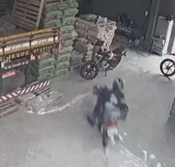 Uma câmera de segurança registrou o momento em que um motociclista perde o controle do veículo e colide contra sacas...