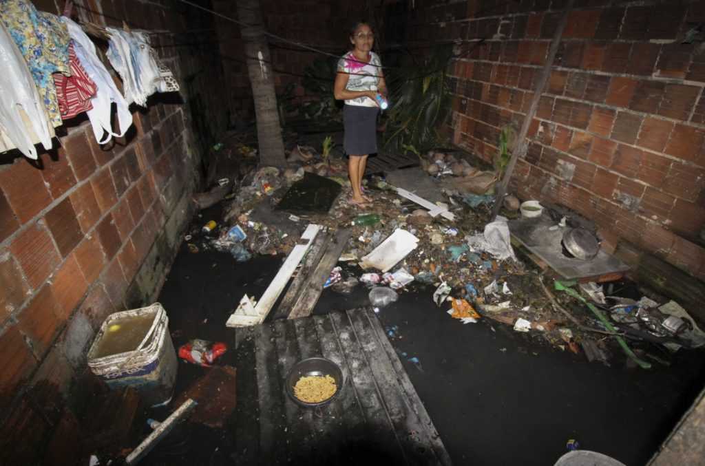 Dona de casa, Kessia Dantas, 37, mora em casa de frente para a avenida Pompílio Gomes. A moradia compartilhada por ela, o esposo e quatro crianças está com o teto comprometido. A cena de ratos circulando no telhado e descendo pelos móveis é comum, segundo a mulher. Também é rotineiro que todos da família tenham problemas de saúde. O cachorro da família fica preso sobre um móvel acima do nível da água para não ter contato com a sujeira.