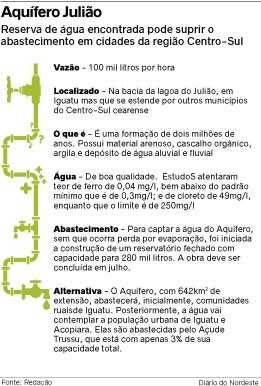 Após a perfuração de seis poços e testes de vazão de pelo menos 24 horas com liberação regular média de 100 mil litros por hora, geólogos da Secretaria de Agricultura, Pecuária e Desenvolvimento Rural de Iguatu, na região Centro-Sul do Ceará, confirmaram a existência de um aquífero na Bacia da Lagoa do Julião com cerca de 642 km², que se estende a outros municípios.