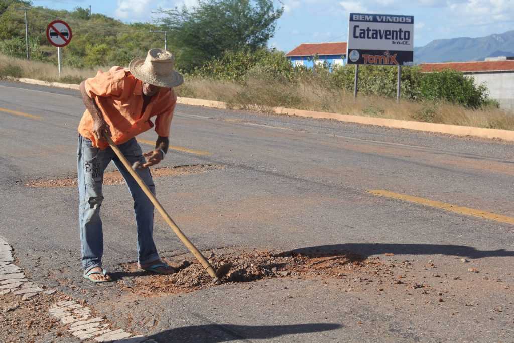O agricultor Antônio Augusto, na localidade de Catavento, zona rural de Icó, é um dos que ficam à margem da BR 116 tapando buracos com terra. É uma forma de ganhar algum trocado. Com uma enxada na mão, ele passa parte do dia jogando terra, ajeitando, um mesmo buraco, e quando vem veículos estende a mão e com um gesto entre o dedo indicador e polegar, pede dinheiro.
