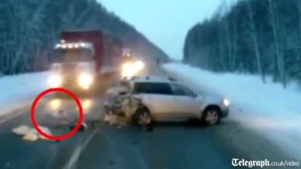 Uma criança de um ano sobreviveu após ser arremessada do carro onde estava em um acidente e quase ser atropelada por um caminhão na Rússia, segundo o jornal “The Telegraph”. Uma câmera instalada em um carro que seguia atrás do veículo acidentado registrou o acidente.