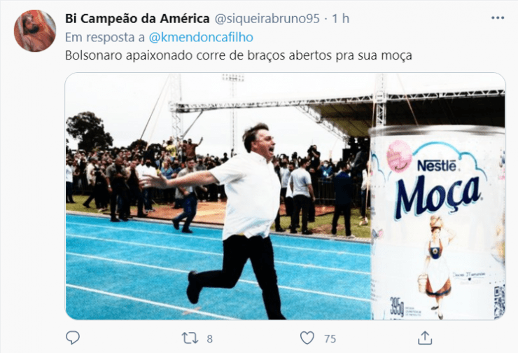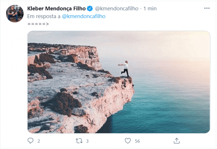 O diretor dos filmes Bacurau (2019) e Aquarius (2016), Kleber Mendonça Filho, foi uma das personalidades que compartilharam a foto em sua conta oficial no Twitter. Na legenda do post, ele instigou seus seguidores a descreverem da melhor forma a cena protagonizada por Bolsonaro. “Aguardando as melhores legendas”, escreveu o Mendonça Filho, que também compartilhou uma montagem do presidente prestes a cair de um penhasco.