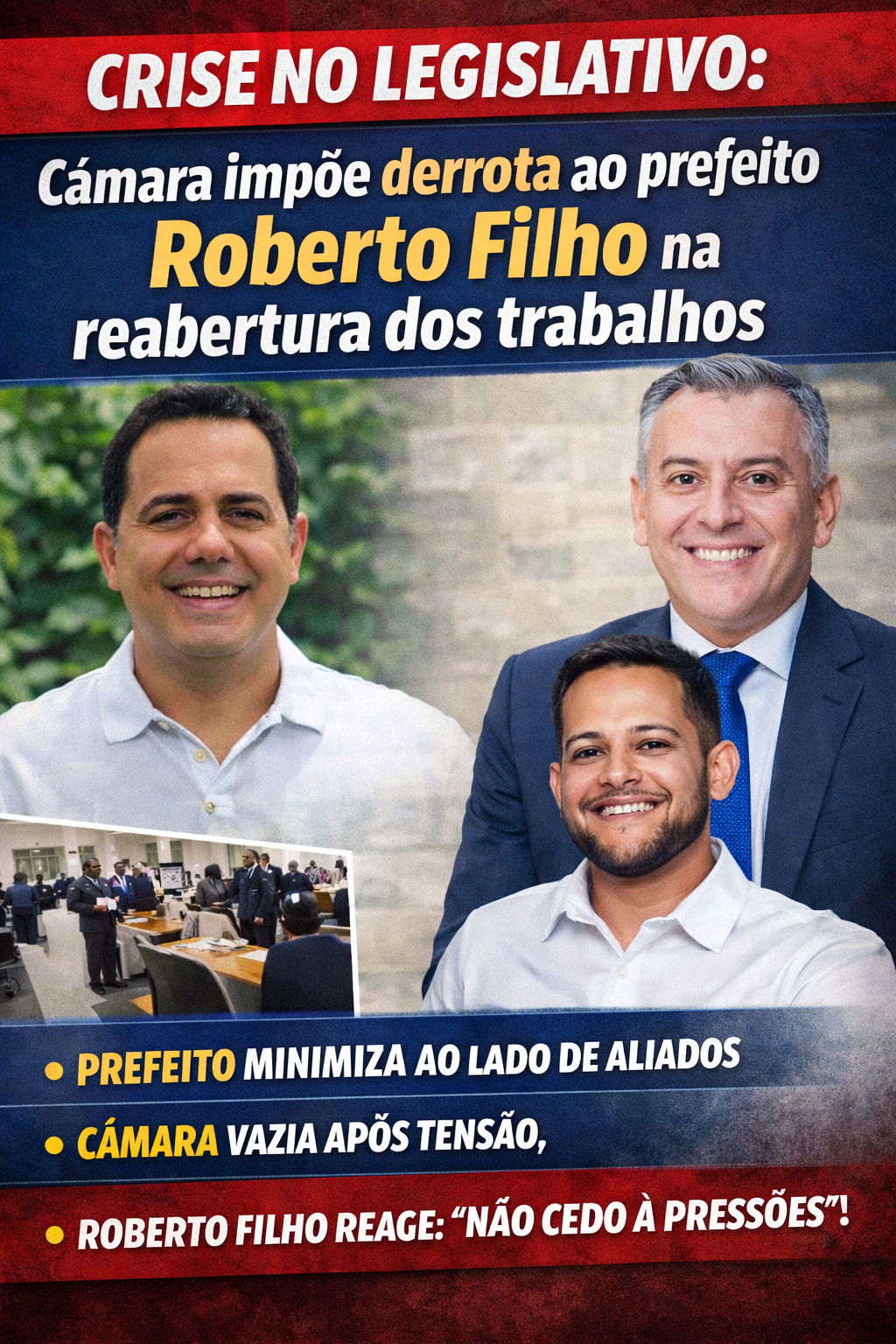 Câmara expõe fissuras na base e impõe derrota simbólica ao prefeito Roberto Filho na reabertura dos trabalhos