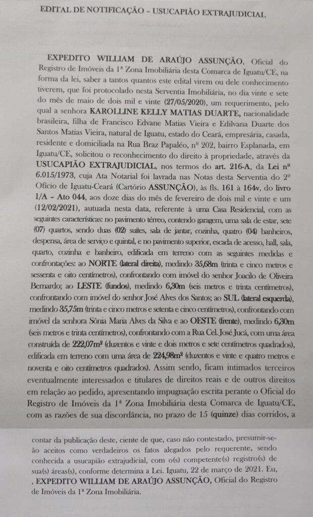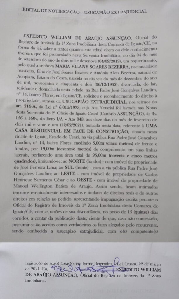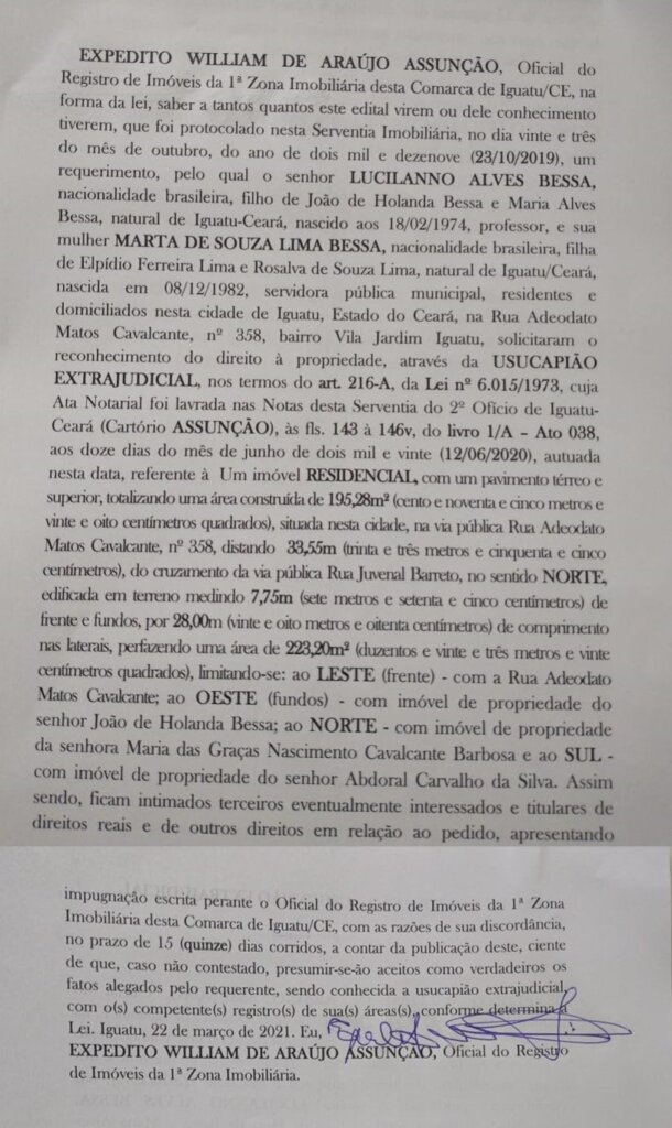Cartório 2º Ofício lança editais de notificação; Usucapião Extrajudicial