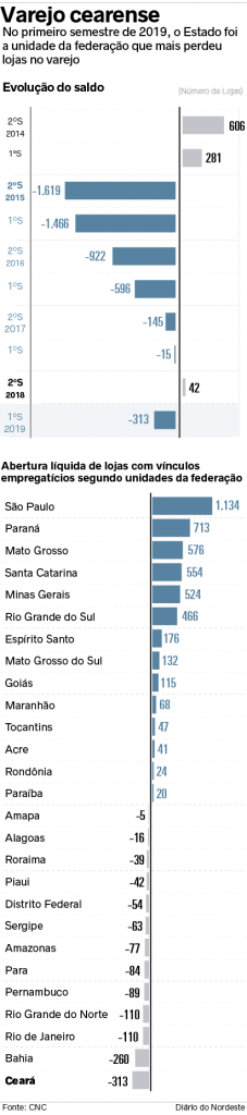 Segundo Bentes, o Ceará vinha mostrando uma tendência de melhora desde 2017. “Chegou a ser positivo no segundo semestre de 2018 em 42 lojas, depois de seis semestres com saldo negativo. Agora, voltou a ser negativo – 313 lojas fechadas é ruim, mas na segunda metade de 2015, foram 1.619 lojas fechadas no Estado”, ressalta.
