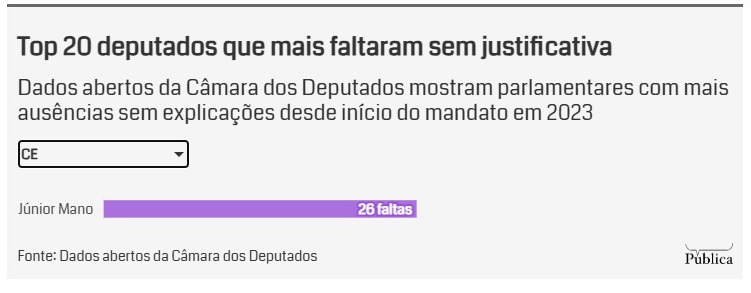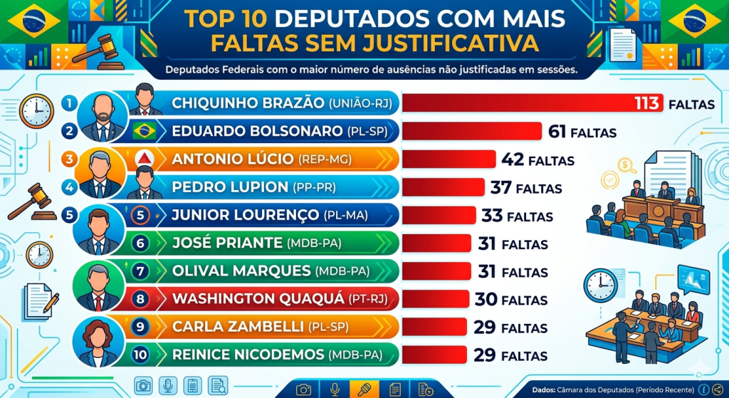 Além da atuação política, outro indicador relevante é a presença em plenário. Dados abertos da Câmara dos Deputados do Brasil mostram que parte dos parlamentares com maior visibilidade também aparece entre os que mais acumulam faltas sem justificativa desde o início do mandato em 2023.