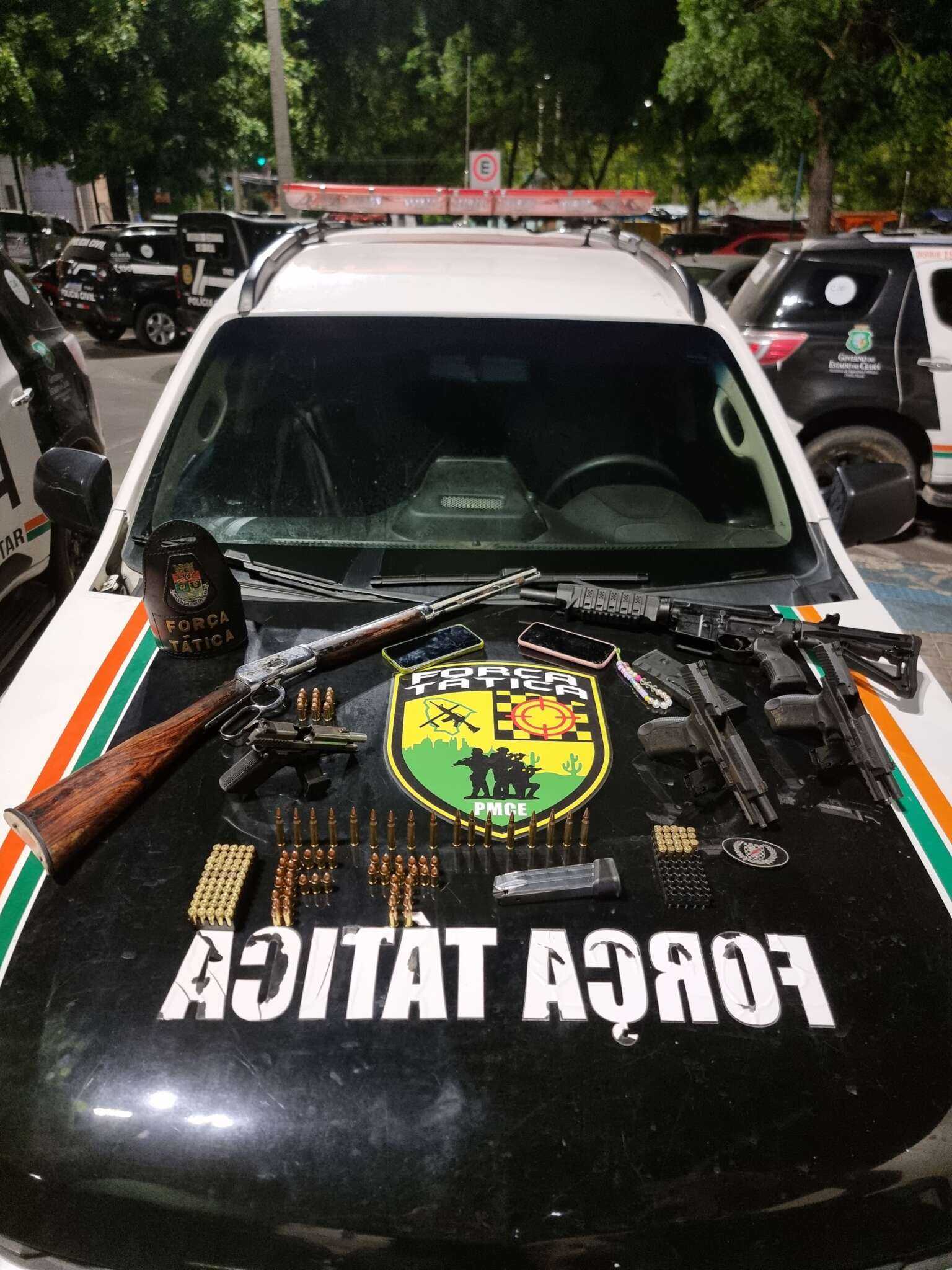No total, foram apreendidas três pistolas, um rifle, um fuzil e duas granadas, além de 132 munições e três celulares. O material explosivo foi detonado pelo Batalhão de Operações Policiais Especiais (Bope) da PMCE.