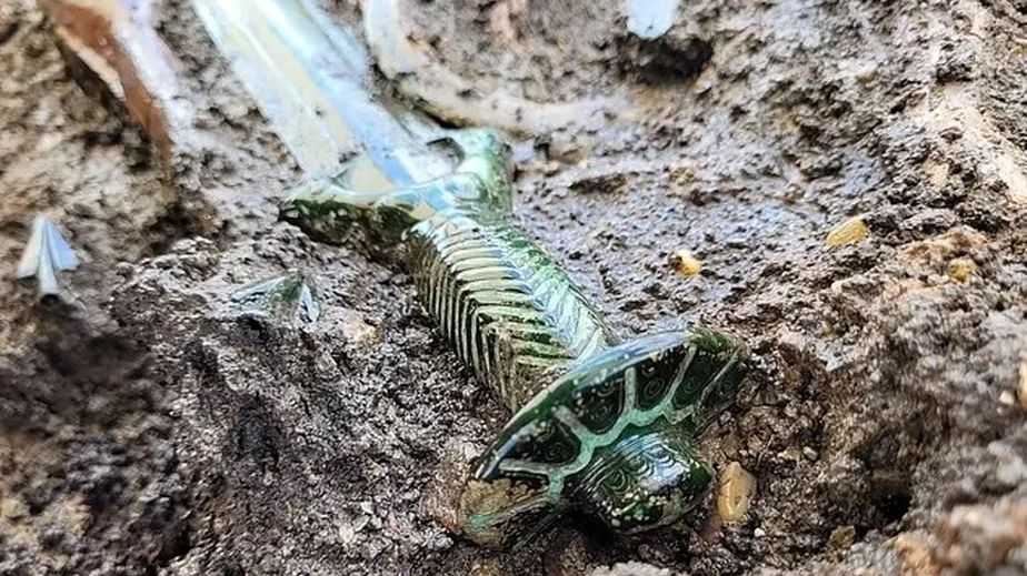 A relíquia foi encontrada na semana passada em um túmulo contendo os restos mortais de três pessoas: um homem, uma mulher e um adolescente. A origem exata da espada ainda não pode ser determinada pelos especialistas.