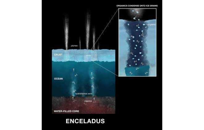 Os novos orgânicos, observados pelo analisador de poeira cósmica (Cosmic Dust Analyzer – CDA) da Cassini, são compostos que contêm nitrogênio e oxigênio. O material é expelido do núcleo a partir de dutos hidrotermais, se mistura com a água do oceano subterrâneo de Encélado e jorra em forma de cristais de gelo.