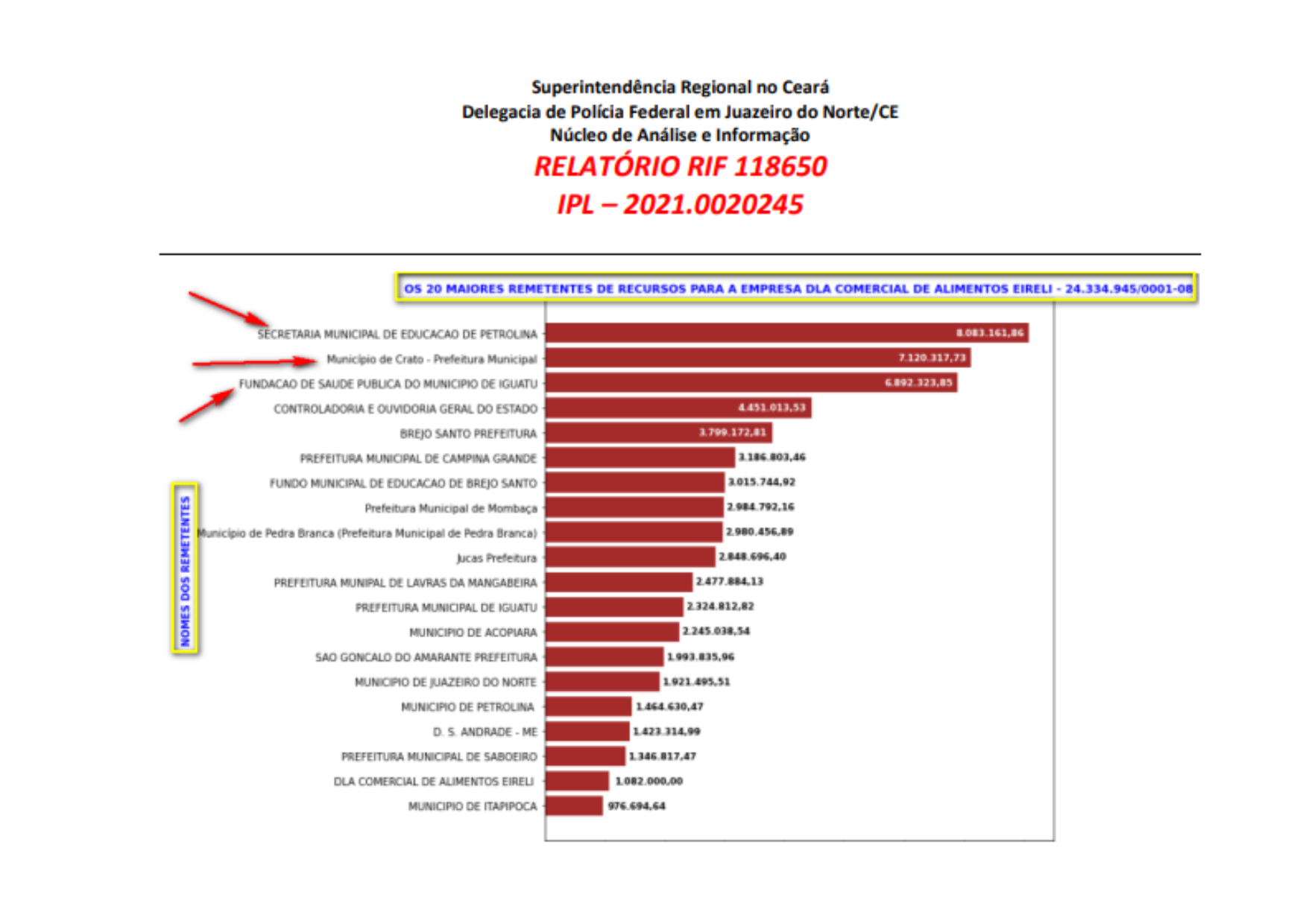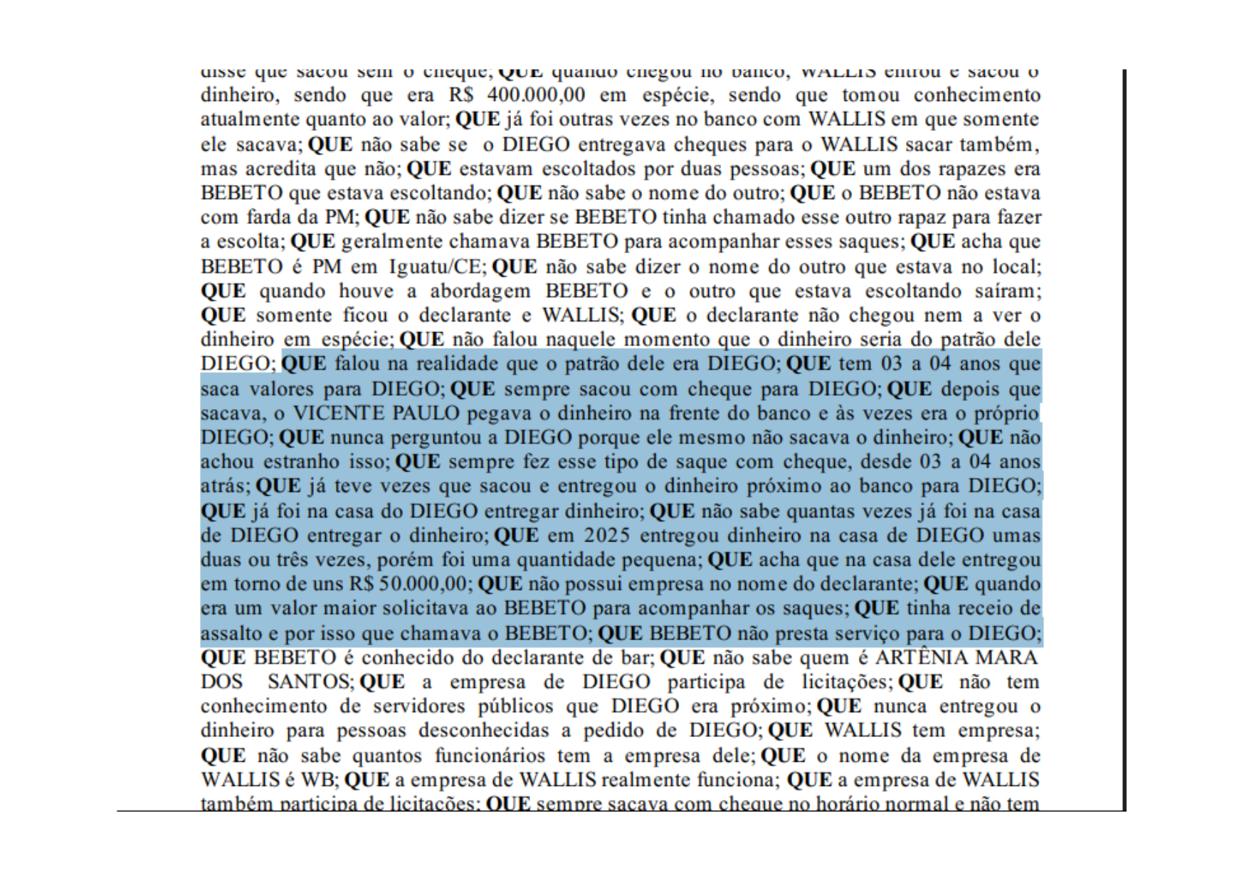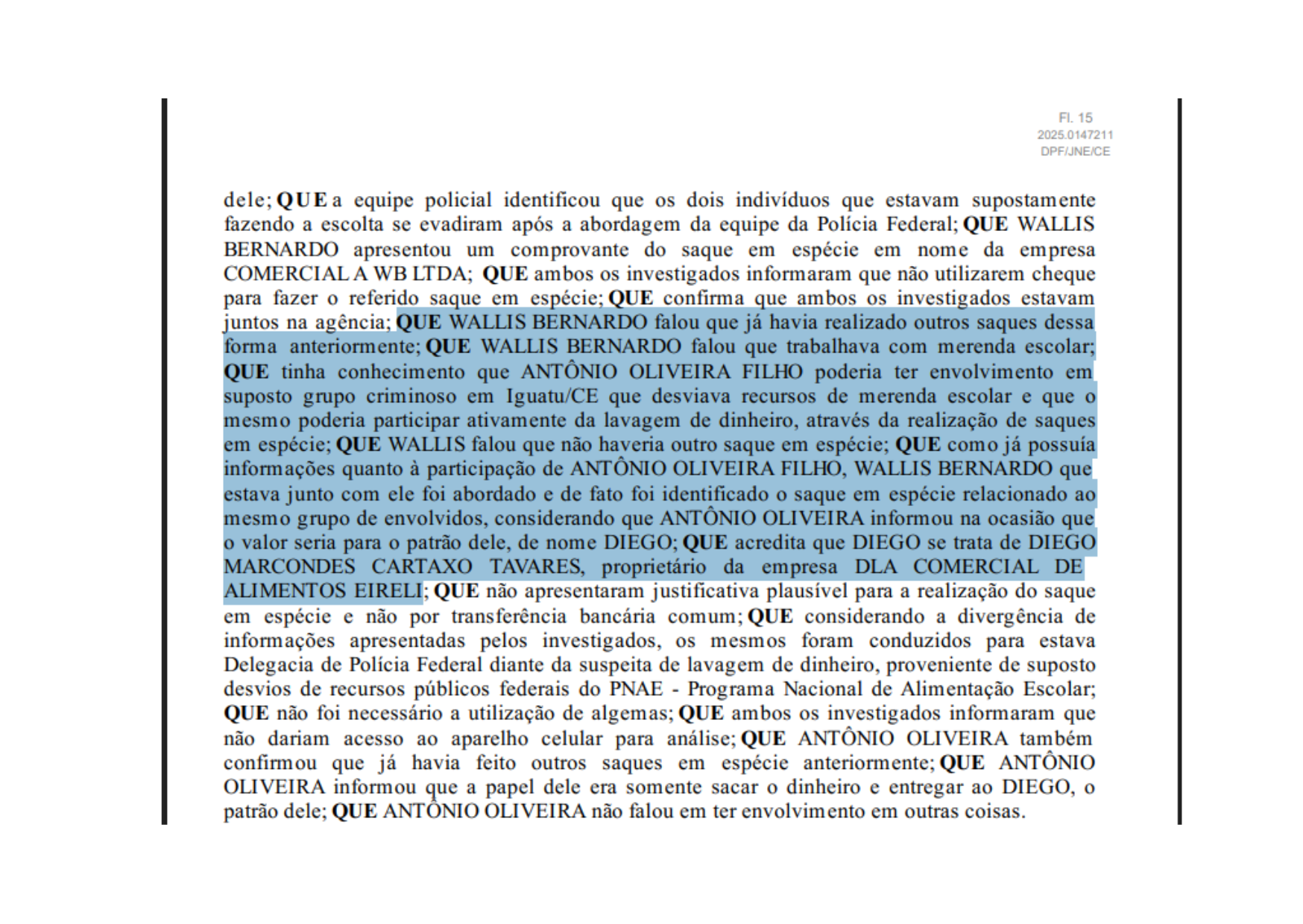 Antônio Oliveira Filho afirmou que o valor seria entregue a seu “patrão”, identificado como Diego Marcondes Cartaxo Tavares, empresário do ramo de fornecimento de alimentos e proprietário da DLA Comercial de Alimentos EIRELI, empresa também investigada pela Polícia Federal.