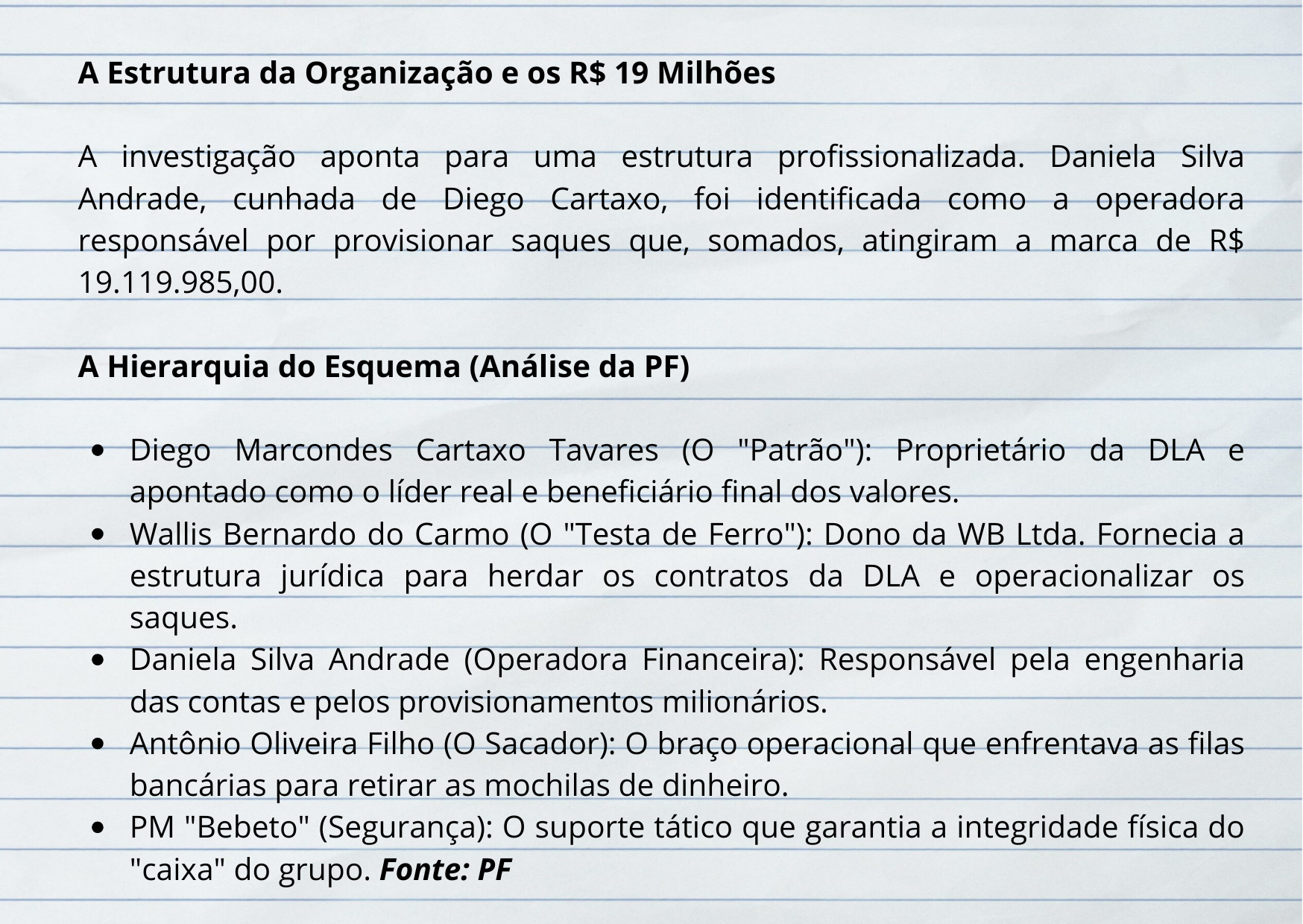 Conforme consta nos autos, um dos acompanhantes foi identificado como “Bebeto”, policial militar, que teria atuado como uma espécie de escolta informal durante o trajeto até o banco.