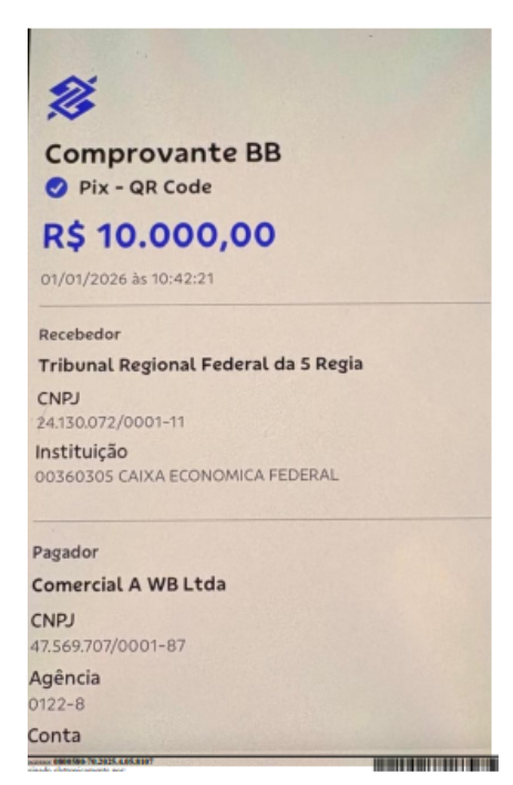 O pagamento foi realizado via PIX, tendo como pagadora a empresa Comercial A WB Ltda, com identificação bancária vinculada à Caixa Econômica Federal.O que está em jogo