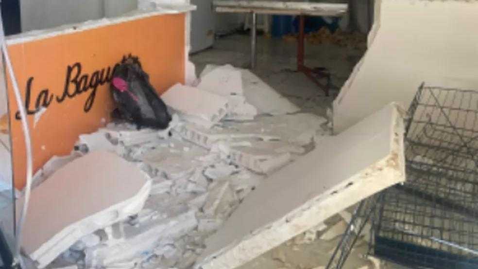 O estabelecimento teve o portão e o forro derrubados pela força da explosão, que também destruiu produtos expostos na vitrine.