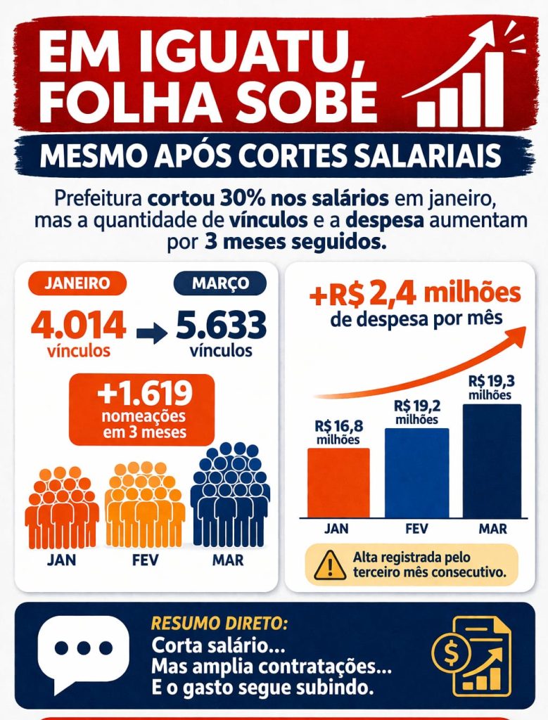 Mesmo após o anúncio de corte de 30% nos salários de comissionados, prefeito e secretários, a Prefeitura de Iguatu registra aumento contínuo na folha de pagamento.