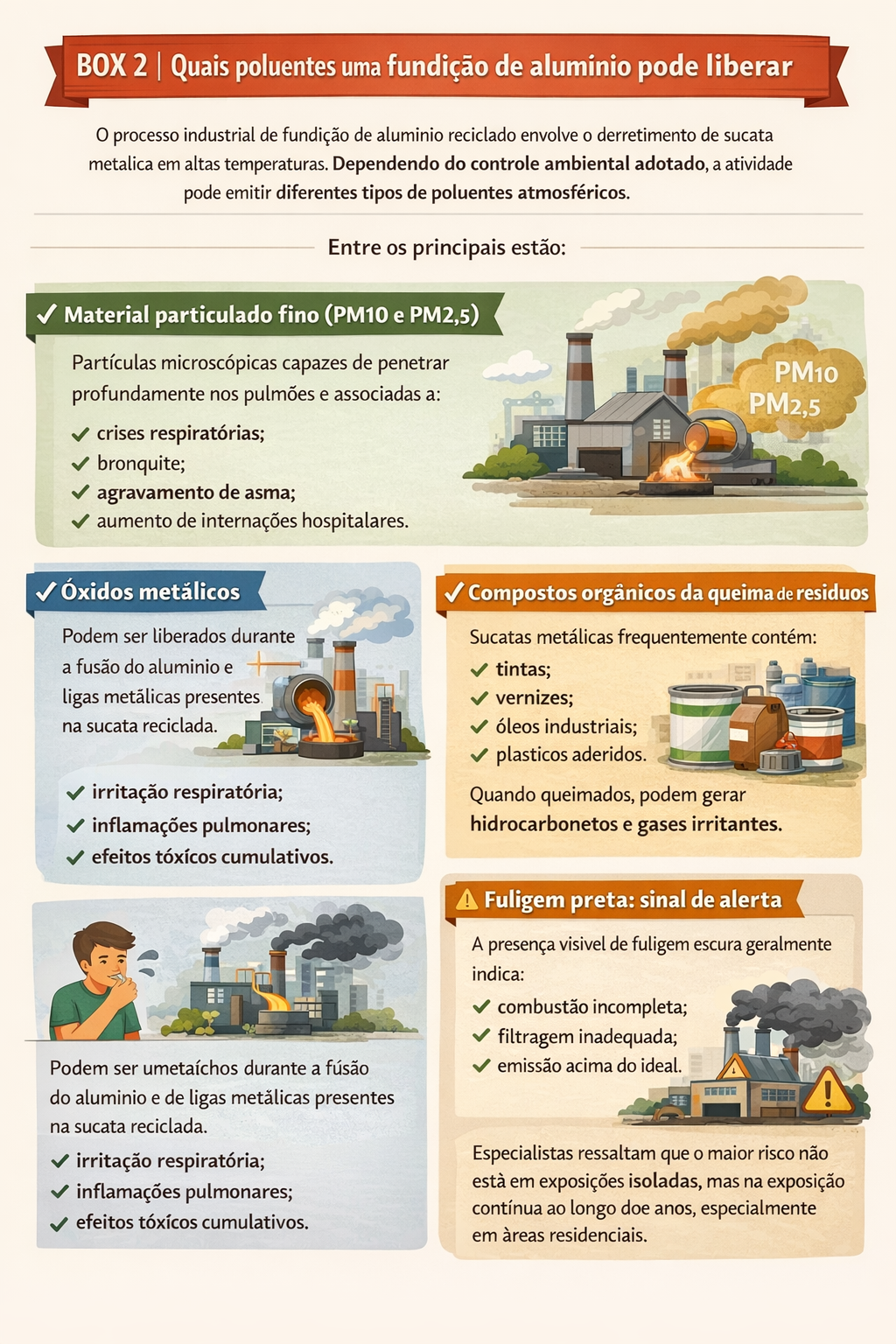 A fundição trabalha com fusão de alumínio reciclado — processo que pode gerar material particulado fino e resíduos provenientes da queima de tintas, óleos e contaminantes presentes na sucata metálica.