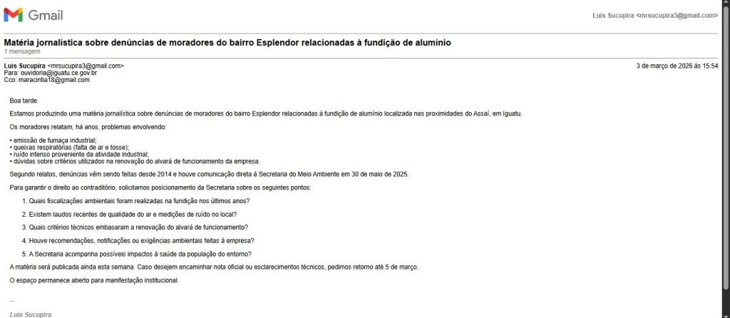 A reportagem enviou e-mail e mensagens oficiais à empresa Corban, responsável pela fundição, e também à Prefeitura de Iguatu, encaminhando questionamentos sobre: