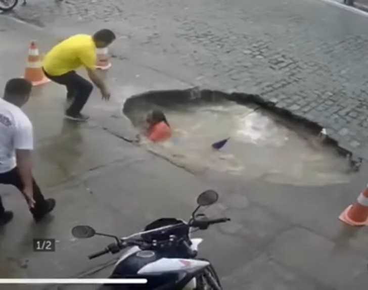 Funcionária pública é “engolida” por cratera após calçada desabar em frente à funerária