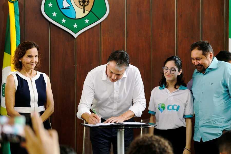 O governador Camilo Santana sancionou, nesta terça-feira (1º), a lei que trata do Programa Estudar Fora. A iniciativa tem como objetivo garantir aos estudantes da rede pública estadual de ensino a possibilidade de aprofundar os conhecimentos em uma língua estrangeira por meio de intercâmbio internacional, de forma gratuita. A solenidade de lançamento, realizada no Palácio da Abolição, contou com a participação da vice-governadora Izolda Cela, da secretária da Educação, Eliana Estrela, além de estudantes, professores e diretores de escolas estaduais.