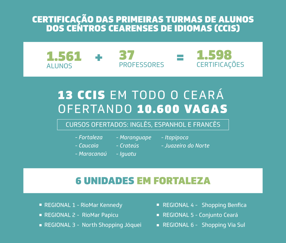 Através de transmissão ao vivo pelas redes sociais, o Governo do Ceará certificou nesta quinta-feira (28) as primeiras turmas de estudantes e professores que concluíram os cursos de Inglês, Espanhol e Francês em 11 dos 13 Centros Cearenses de Idiomas (CCIs). Além do governador Camilo Santana, participaram do evento a vice-governadora Izolda Cela, a secretária da educação Eliana Estrela, e o presidente interino da assembleia legislativa, o deputado estadual Fernando Santana. Ao todo, 1.598 alunos e professores concluíram um idioma nas unidades localizadas em Fortaleza – Benfica, Sul, Papicu, Conjunto Ceará, Jóquei e Kennedy -; além de sedes em Crateús, Caucaia, Juazeiro do Norte, Itapipoca e Iguatu. Maranguape e Maracanaú, unidades mais recentes da lista, ainda não concluíram turmas.