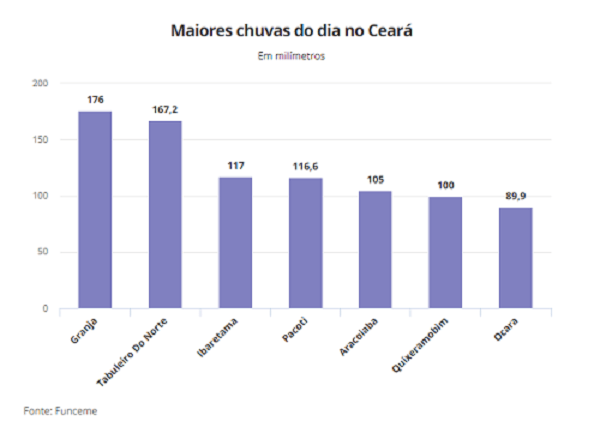 Os municípios de Granja, na Região Norte do Ceará e Tabuleiro do Norte, no Vale do Jaguaribe, registraram as maiores chuvas entre as 7h de quarta-feira (13) e 7h desta quinta-feira (14). Segundo dados da Fundação Cearense de Meteorologia e Recursos Hídricos (Funceme), as cidades tiveram precipitações de 176 milímetros e 167,2 milímetros, respectivamente.