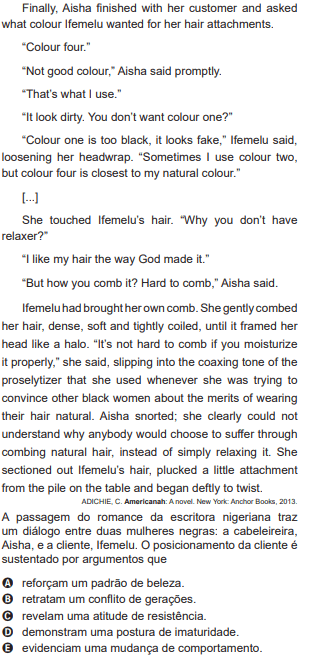 Na prova de Inglês, uma questão trazia um trecho do romance “Americanah”, da escritora nigeriana Chimamanda Ngozi Adichie. Na cena retratada na passagem, a cliente recusa a oferta da cabeleireira de alisar seu cabelo e opta pelas madeixas naturais. No primeiro gabarito dado pelo Inep, o posicionamento da cliente era marcado por argumentos que “demonstram uma postura de imaturidade”. Agora, na nova versão, a alternativa correta é “revelam uma atitude e resistência”.