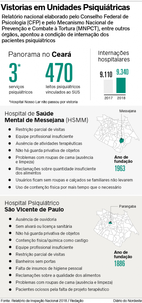 Se não bastasse a condição de enfrentar uma psicopatologia, pacientes de dois hospitais psiquiátricos no Ceará passam ainda por diversos problemas de atendimento identificados por uma vistoria nacional. O relatório “Hospitais Psiquiátricos no Brasil: Relatório de Inspeção Nacional” expõe pontos observados em dezembro de 2018, em 40 unidades psiquiátricas brasileiras, nas cinco regiões do País. No Ceará, foram inspecionados o Hospital de Saúde Mental de Messejana (HSMM) e o Hospital Psiquiátrico São Vicente de Paulo, ambos em Fortaleza.