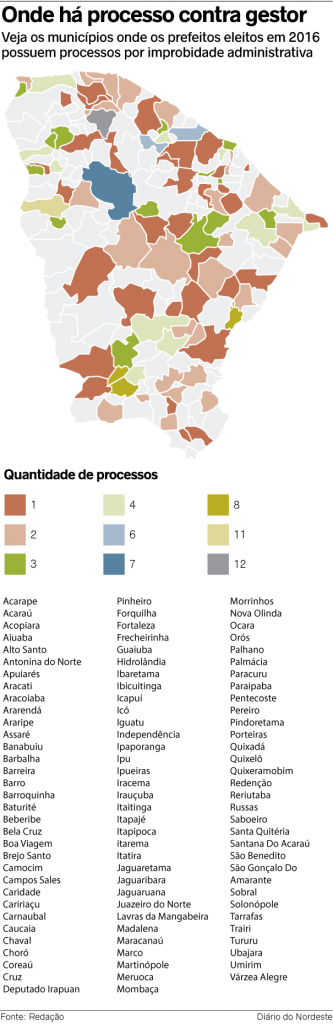 O Diário do Nordeste opta por não citar os nomes dos envolvidos nos casos aqui relatados em virtude de os processos não terem sido julgados pela Justiça. A reportagem tentou ouvir o presidente da Associação dos Municípios do Estado do Ceará (Aprece), Francisco Nilson Alves Diniz, sobre a incidência de crimes de improbidade administrativa nas prefeituras cearenses, mas o gestor não atendeu.