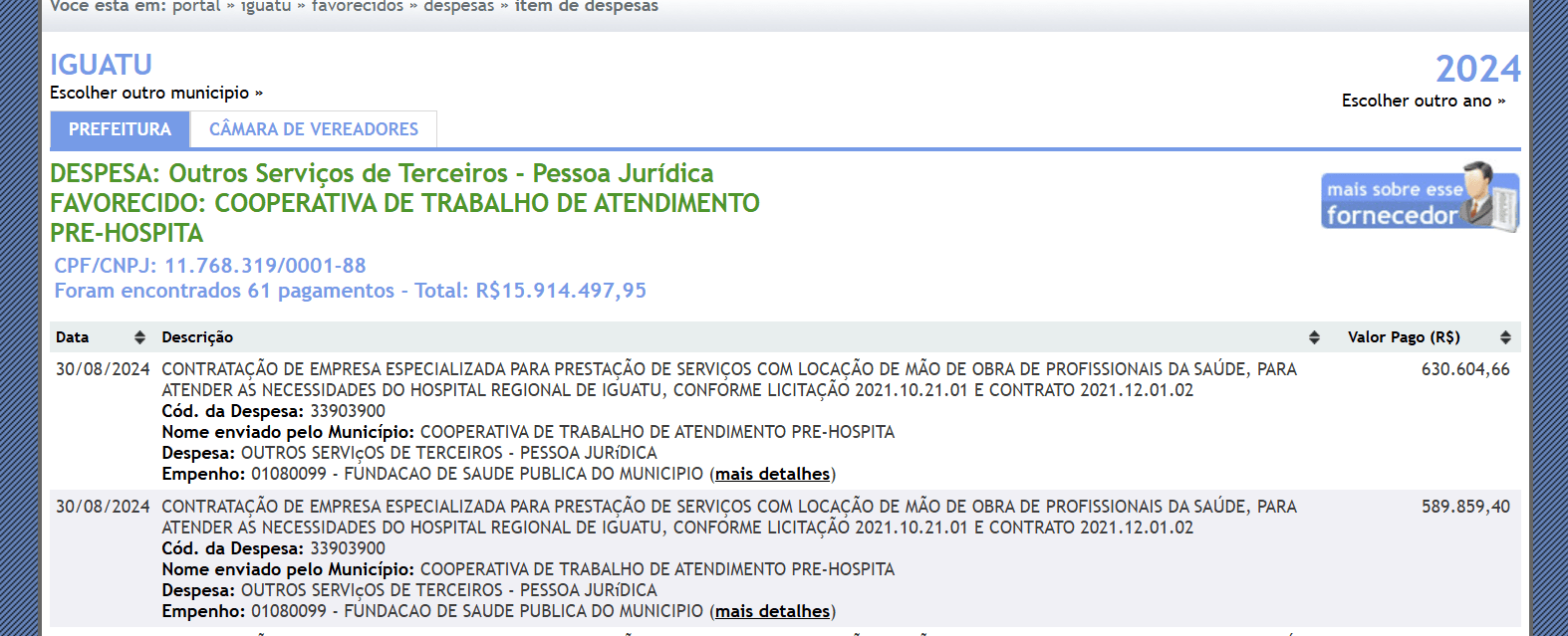 Em 2024 a COOPERATIVA já recebeu R$ 15.914.497,95, além dos diversos débitos trabalhistas: