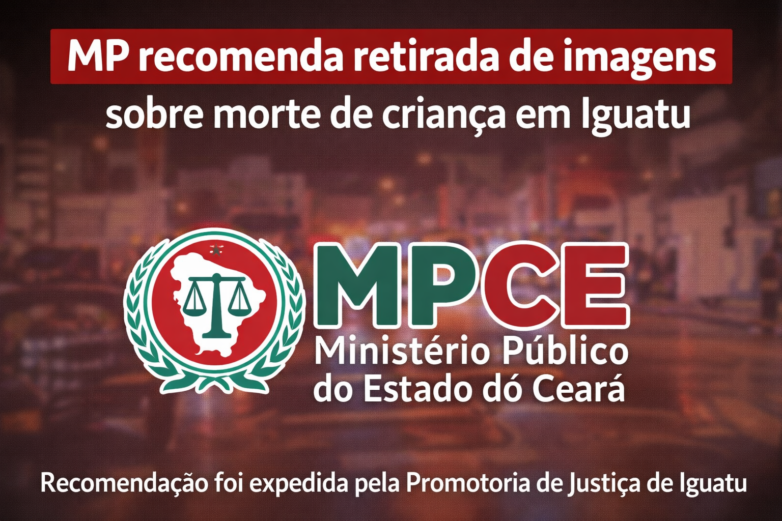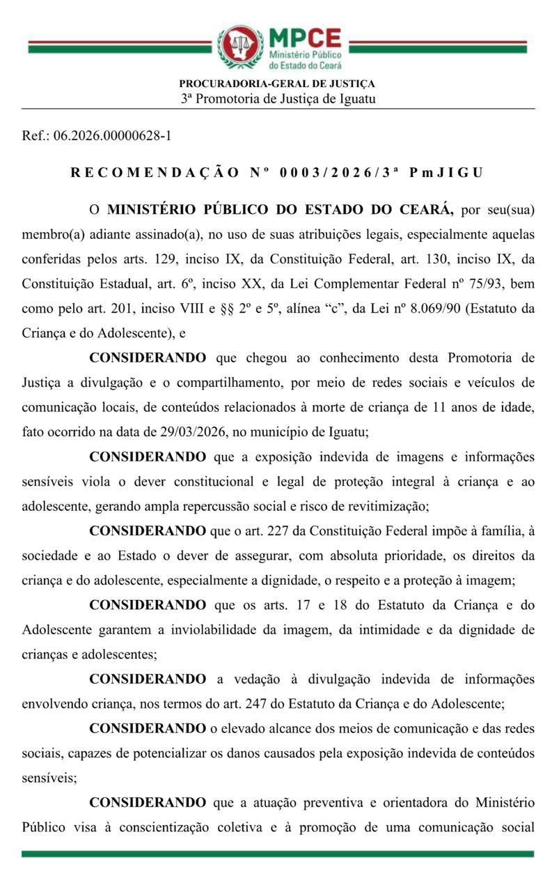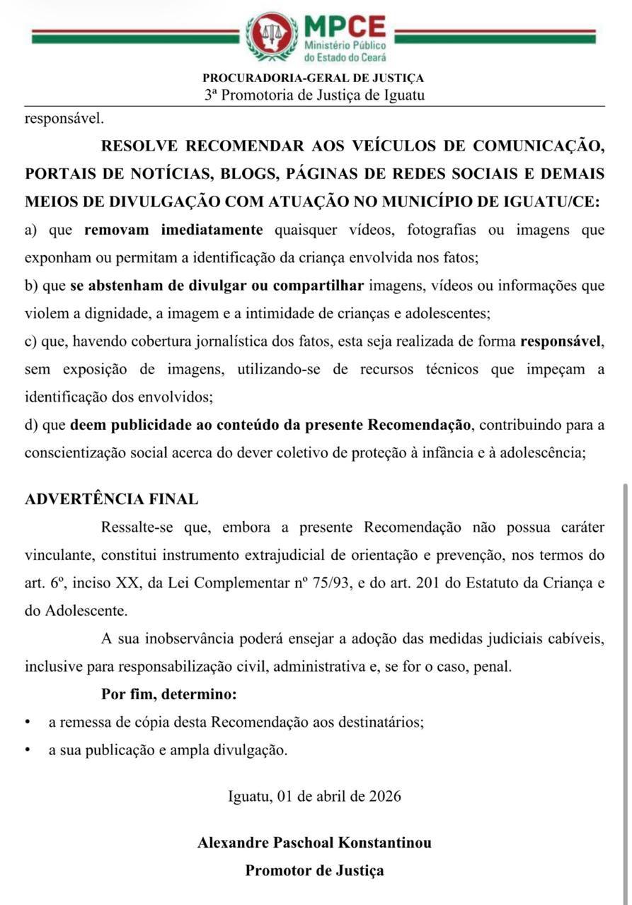 O Ministério Público do Estado do Ceará, por meio da 3ª Promotoria de Justiça de Iguatu, expediu nesta terça-feira (1º) a Recomendação nº 0003/2026 determinando que veículos de comunicação, blogs e páginas em redes sociais removam imediatamente conteúdos que exponham uma criança de 11 anos, vítima de um caso ocorrido no município no último dia 29 de março.