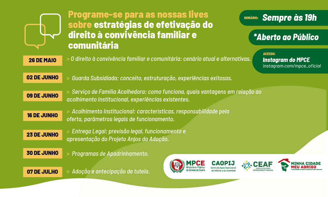 O Ministério Público do Estado do Ceará (MPCE), por intermédio do Centro de Estudos e Aperfeiçoamento Funcional (CEAF) e do Centro de Apoio Operacional da Infância e da Juventude (Caopij), vai promover uma série de lives temáticas para divulgar estratégias para efetivação do direito à convivência familiar e comunitária de crianças e adolescentes. Com início a partir de 26 de maio, os eventos serão abertos ao público e transmitidas através do Instagram do MPCE (instagram.com/mpce_oficial). A iniciativa integra as ações do projeto estratégico “Minha Cidade, Meu Abrigo” que tem como gerente o coordenador auxiliar do Caopij, promotor de Justiça Dairton Oliveira.