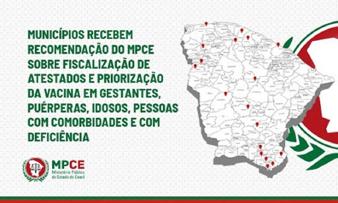O Ministério Público do Estado do Ceará (MPCE) já recomendou, desde a última semana, que 41 municípios e suas Secretarias de Saúde adotem medidas para priorizar a imunização de grávidas, puérperas, idosos, pessoas com comorbidades e com deficiência. Entre as orientações está a implementação, por parte da administração municipal, de fiscalização para evitar burla na descrição de comorbidades. Para isso, é exigida apresentação de atestado médico e, nos locais de vacinação, os Municípios devem disponibilizar equipe médica para verificar, por amostragem e de forma aleatória, a confirmação da comorbidade.