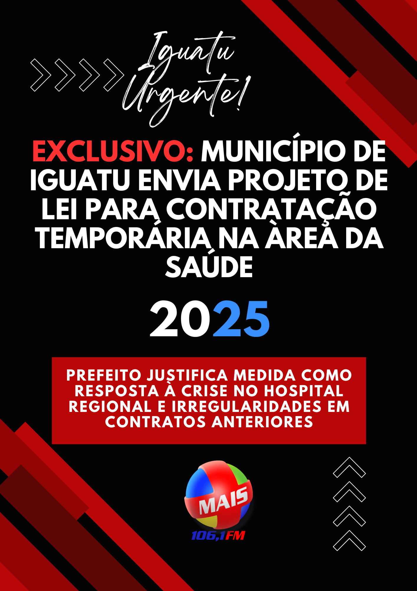 A Prefeitura de Iguatu encaminhou à Câmara Municipal, nesta terça-feira (2), um Projeto de Lei que autoriza a contratação de profissionais da saúde por tempo determinado. A proposta visa atender à necessidade temporária de excepcional interesse público, conforme o inciso IX do artigo 37 da Constituição Federal.