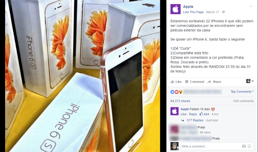 Não passam dois meses sem que surja uma nova corrente no Facebook prometendo um sorteio de iPhones. O golpe é sempre o mesmo. Uma página na rede social com o título “Apple” diz que vai sortear um número X de aparelhos (a quantidade varia a cada vez que o golpe é anunciado na rede social), porque a caixa está sem a película exterior, o que inviabiliza que o produto seja comercializado.