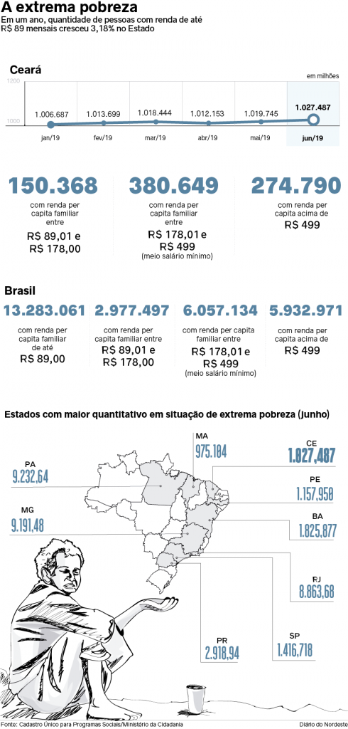 Estado é o quarto do País em quantitativo de pessoas sobrevivendo com até R$ 89 por mês. Em junho de 2019, 1,027 milhão de famílias cearenses estavam nessa situação, de acordo com dados do Ministério da Cidadania.