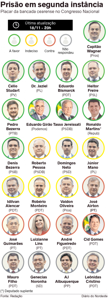 Dos 22 deputados federais do Ceará, oito se posicionam a favor da prisão de réu condenado após 2ª instância, outros quatro são contra, seis estão indecisos, e quatro não responderam.