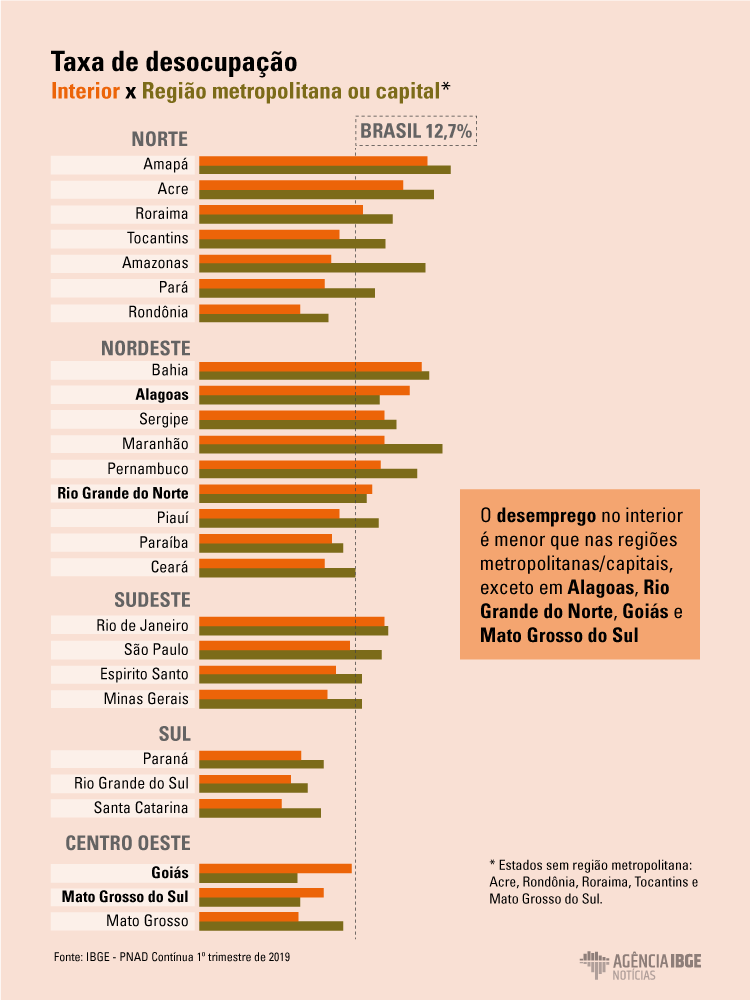 Um levantamento feito a partir dos microdados da Pesquisa Nacional por Amostra de Domicílios Contínua (PNAD Contínua) revelou um retrato inédito do mercado de trabalho do interior do país. As informações do primeiro trimestre de 2019 mostram que o desemprego no interior é menor que nas regiões metropolitanas em 18 estados. Entre os cinco estados sem região metropolitana, apenas o interior do Mato Grosso do Sul tem a desocupação maior que a capital.