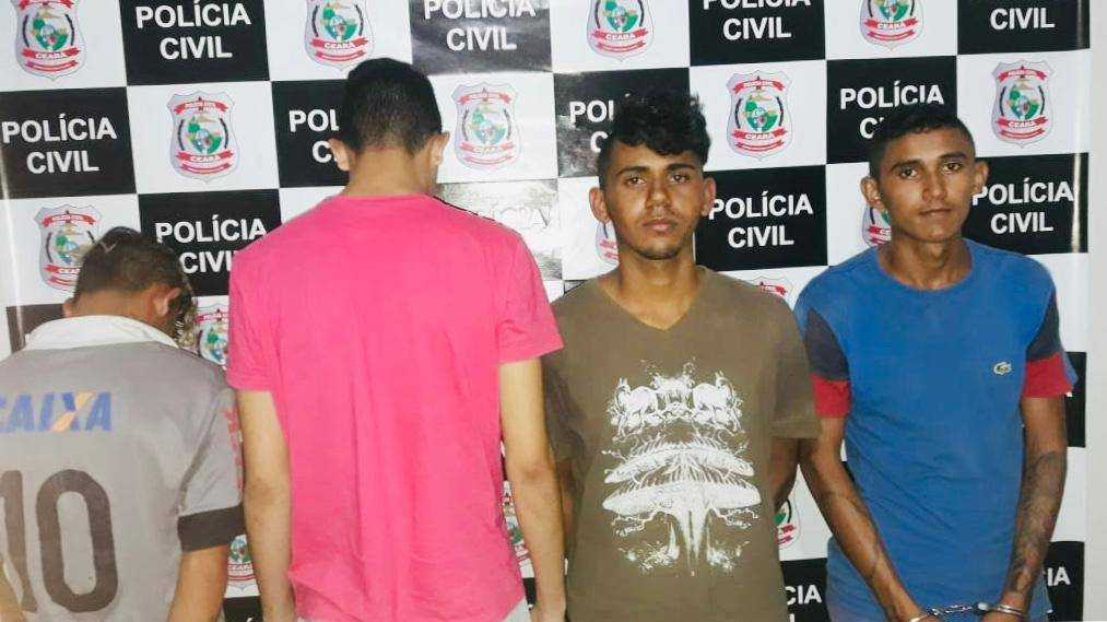 Policiais Civis da Delegacia Regional de Senador Pompeu prenderam três suspeitos de assaltar uma moradora da cidade nesta sexta-feira, 8, e mais um suspeito de tráfico de drogas. Um dos assaltantes estava armado com revólver e o trio levou a quantia de cem reais e uma aliança da vítima que não teve a identidade revelada.