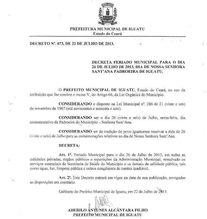 Foto: Reprodução[/caption]O prefeito de Iguatu, Aderilo Antunes Alcântara Filho, baixou na segunda-feira (22) o decreto nº 073, que determina feriado municipal no dia de Nossa Senhora Sant’Ana.