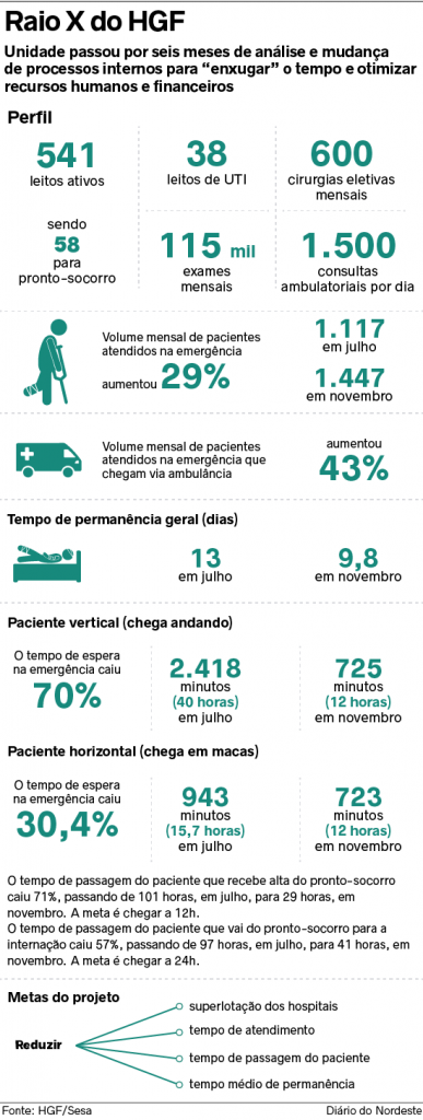 Nem parecia o mesmo cenário do dia 2 de janeiro, quando 184 pacientes estavam espalhados em macas nos corredores do Hospital Geral de Fortaleza (HGF), o maior da rede estadual do Ceará. Alguns chegavam a passar sete dias no local. Ontem, 11 pessoas se encontravam nessa condição, como a reportagem conferiu após a divulgação do balanço final do “projeto Lean nas Emergências”, implantado na unidade de saúde desde julho. A iniciativa busca enxugar processos desnecessários e otimizar o tempo de atendimento de pacientes.