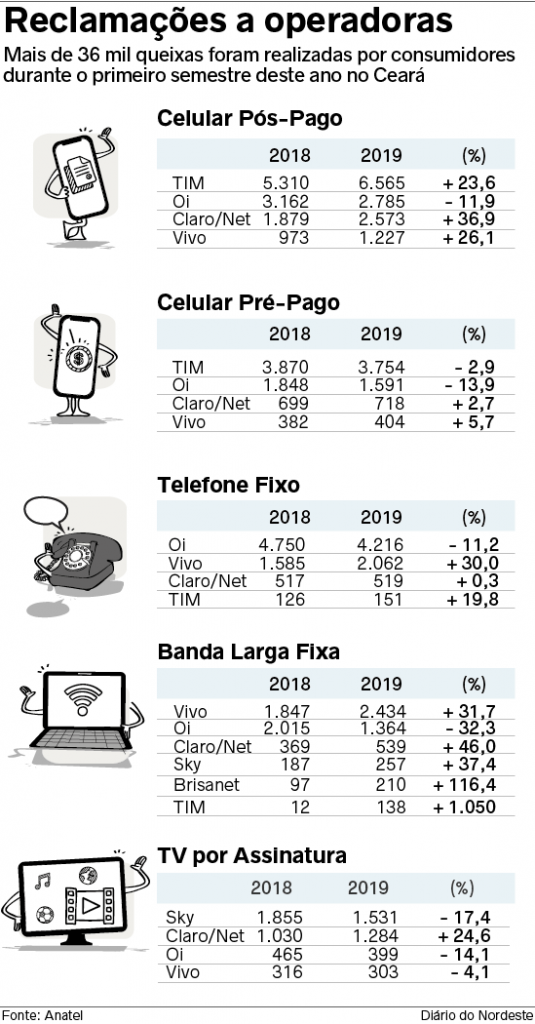 O número de reclamações de cearenses contra operadoras de telefonia fixa e móvel, internet e TV por assinatura cresceu 6,4% no primeiro semestre deste ano em relação a igual período de 2018, de acordo com um levantamento realizado pela Agência Nacional de Telecomunicações (Anatel).