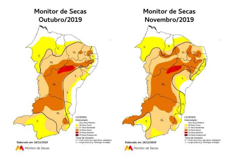Em relação ao mesmo período de 2018, a atual situação do Estado é melhor. Naquela ocasião, o Ceará não apresentava área de seu território livre de seca relativa. Além disso, apresentava 20,68% considerada com seca extrema.