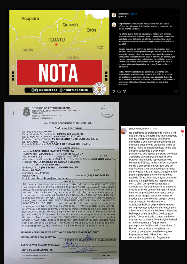 Uma operação das Polícias Civil e Militar realizada em Iguatu resultou na prisão de Emily Kaline Carvalho Gomes suspeita de tráfico de drogas, com apreensão de celulares, drogas, mais de R$ 47 mil, um veículo e outros materiais ilícitos. Posteriormente, um boletim de ocorrência registrado pela advogada Márcia Rúbia Batista Teixeira acusou dois policiais civis de suposta ameaça e perseguição durante a ação. A denúncia causou surpresa e mobilizou o Sindicato dos Policiais Civis do Ceará (SINDPOL-CE) e o delegado responsável pelo caso, José Solano Feitosa, que saíram em defesa dos agentes.