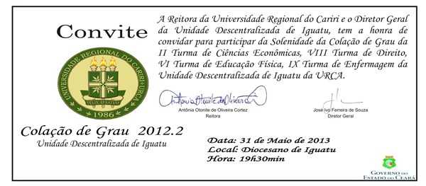 A Universidade Regional do Cariri (URCA), através da Unidade Descentralizada de Iguatu, realiza na próxima sexta-feira, dia 31/05 (sexta-feira), a Solenidade de Colação de Grau 2012.2...