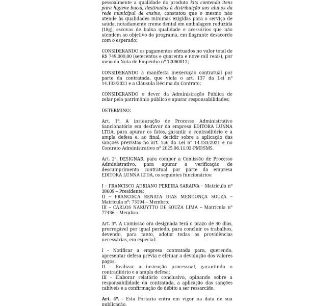 A Secretaria Municipal de Saúde de Iguatu instaurou um Processo Administrativo Sancionatório contra a empresa Editora Lunna Ltda, responsável pelo fornecimento de kits de higiene...