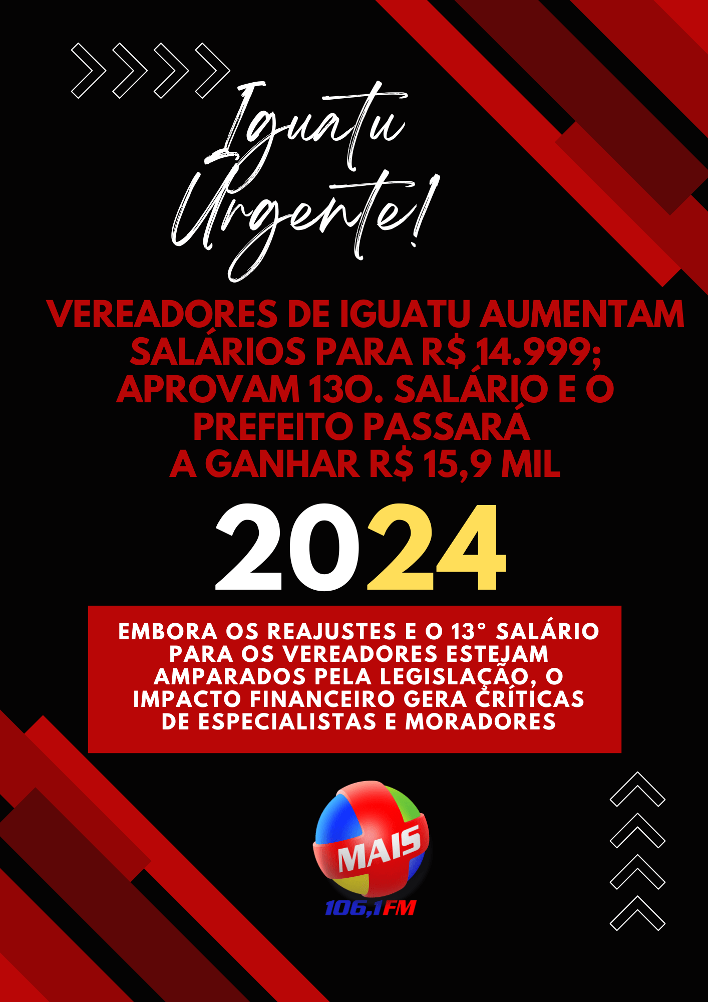 A Câmara Municipal de Iguatu, no Ceará, aprovou, na quinta passada, o PL 112 que trata de um aumento nos salários dos vereadores e do prefeito. A partir de 2025, os parlamentares municipais passarão a receber R$ 14.990,00 mensalmente, além de um 13º salário, enquanto o prefeito terá seu salário reajustado para R$ 15.900,00. Os novos salários valem para 2025.