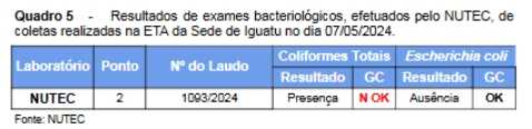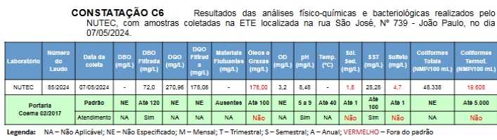 A ETE, que deveria garantir o tratamento adequado do esgoto, estaria operando de forma inadequada e ineficiente. O laudo técnico apontou falhas nos processos de tratamento, o que pode resultar na contaminação da água com microrganismos patogênicos, como bactérias e vírus, colocando em risco a saúde da população. Além disso, a falta de manutenção e ampliação da capacidade instalada compromete ainda mais a eficiência do sistema.