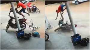 O momento do impacto foi registrado por câmeras de segurança do estabelecimento. Com a batida, os dois ocupantes foram arremessados da moto. Nenhum deles utilizava capacete no momento do acidente.