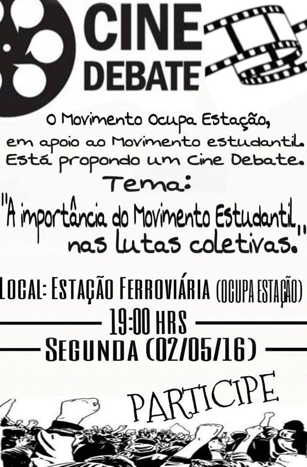 Na noite desta segunda feira ativistas culturais que estão a frente do projeto Ocupa Estação desenvolvem a primeira edição do ‘Cine Debate’ onde será exibido o documentário ‘A importância do movimento estudantil nas lutas sociais’ tendo como pano de fundo a greve estadual dos professores no Ceará, alunos, artistas e professores estarão hoje as 19h na Estação Ferroviária de Iguatu desenvolvendo mais uma ação, com a visão de formação, inclusão e alinhamento dos debates.