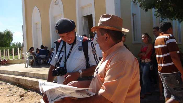 Poeta Barbosa Filho mostra nova edição de seu jornal ao policial Cícero, do PROERD. (Fotos: FAJI)