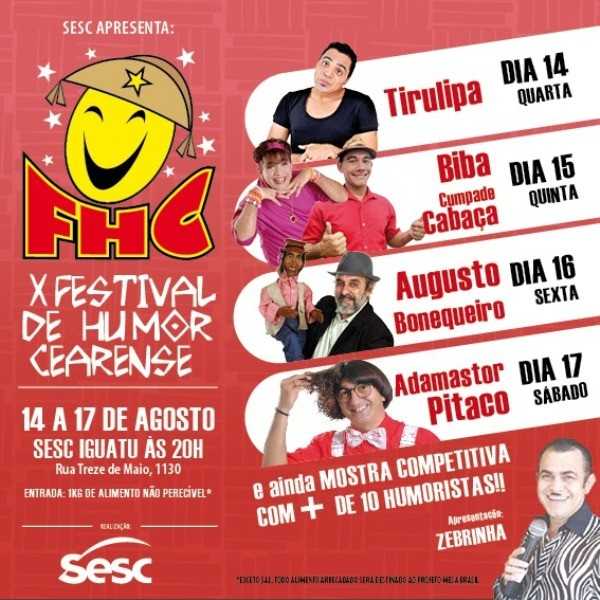 Dia 14 – (Quarta) Tirulipa; Dia 15 – (Quinta) Biba e Cumpade Cabaça; Dia 16 (Sexta) Augusto Bonequeiro; Dia 17 – (Sábado) Adamastor Pitaco. A apresentação é do humorista Zebrinha. Também acontecerá a Exposição “10 Anos de FHC”. No Mercado Público teremos apresentações pela manhã: “Humor na Feira”, onde artistas de rua divulgam o evento. Ainda durante o Festival haverá a Exposição “10 anos de FHC”, contando a história do Festival.